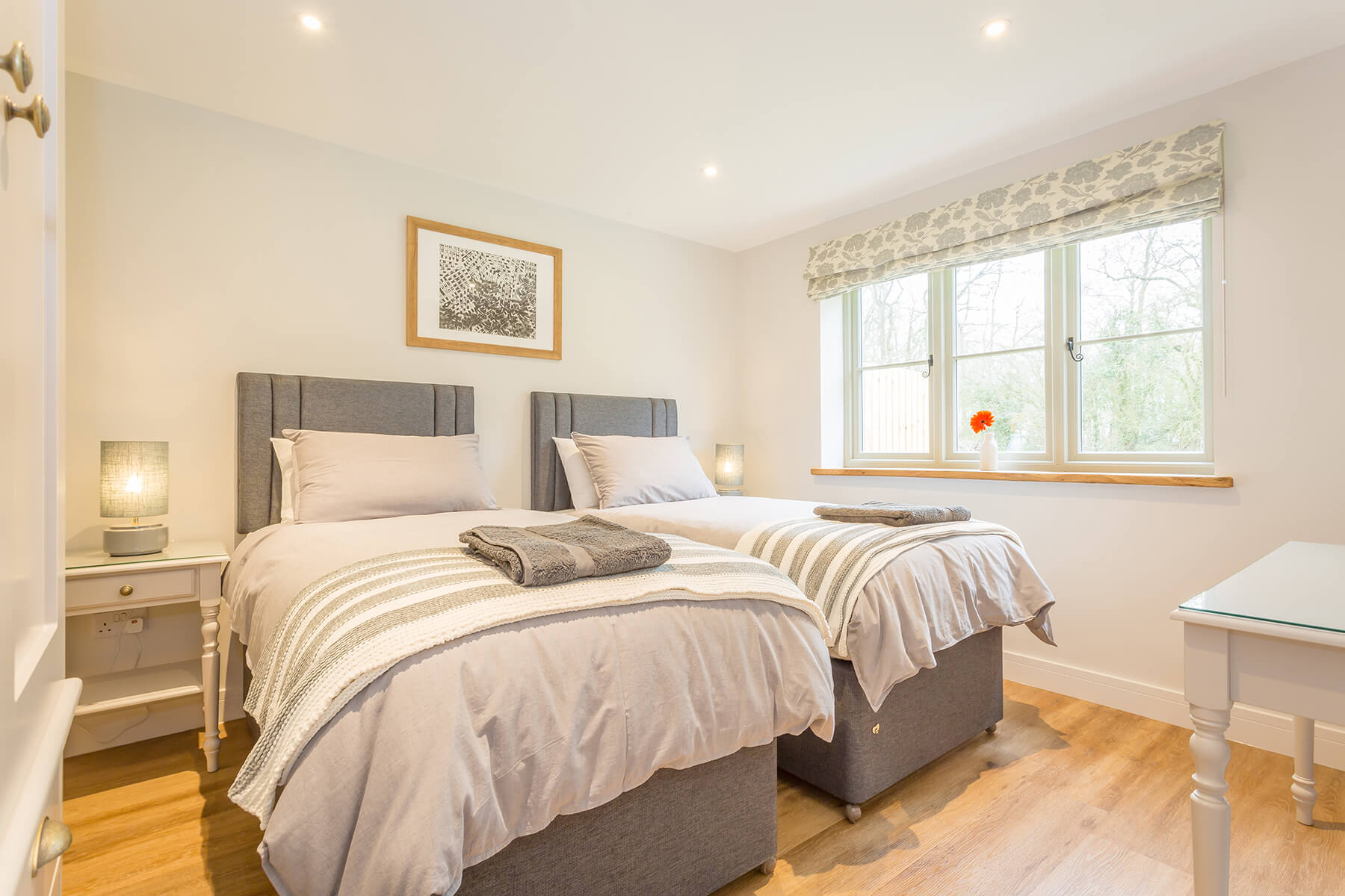 Willow Cottage is a two bedroom cottage with separate family bathroom including a power shower over a bath, making it ideal for families with small children. The open plan layout creates a spacious feel and boasts a modern, well-equipped kitchen, smart TV and dining table seating for four. The two bedrooms and contemporary bathroom are located off the spacious hall. French doors open out to the screened patio area with outdoor furniture, barbecue and lawn. From here, enjoy the glorious views and access to the surrounding ancient woodland.